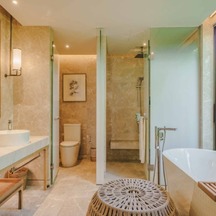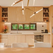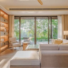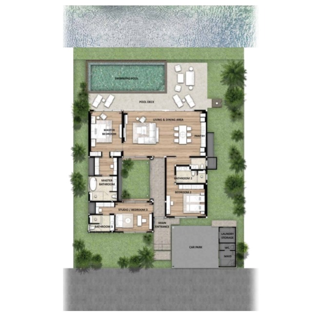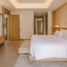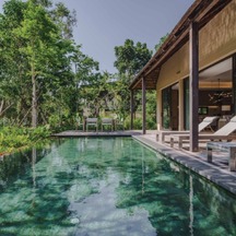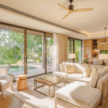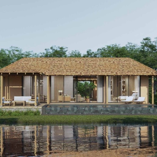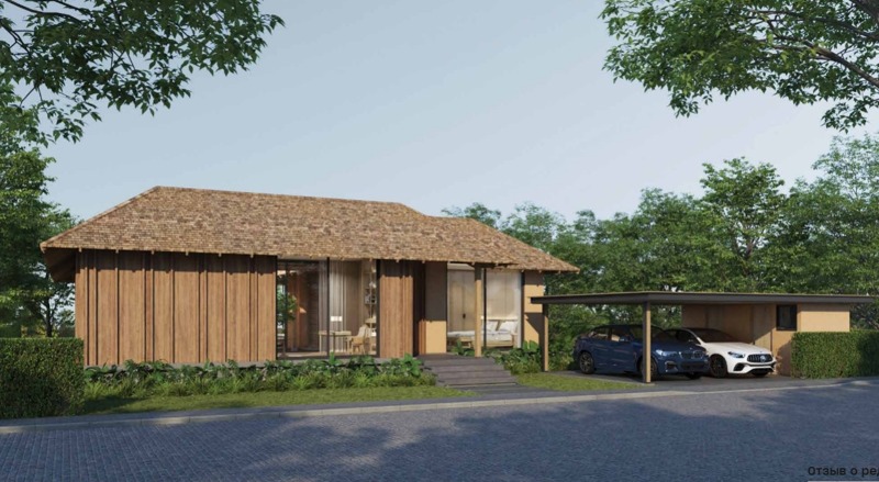 Villa Vana 3 in the Tri Vananda project is a single-story residence with three bedrooms and a total built-up area of 404 square meters. Designed with a focus on harmony with nature, the villa features spacious open-plan interiors, natural materials, and large panoramic windows that provide abundant natural light and seamless indoor-outdoor living. The layout includes a spacious living and dining area, a fully equipped kitchen, and three ensuite bedrooms offering privacy and comfort. Surrounded by lush greenery, the villa sits on a generous land plot, providing ample outdoor space for relaxation, including a private swimming pool and landscaped garden. The design reflects the project's wellness-oriented philosophy, integrating tranquility, sustainability, and connection to the natural environment.