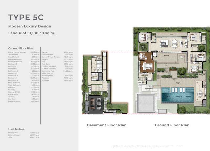 With a total built-up area of 908 sqm on land plots starting from 1,100 sqm, this impressive residence features 5 bedrooms, 7–8 bathrooms, and a dedicated maid’s quarters. The layout includes generous open-plan living, dining, and kitchen areas, complemented by a separate Thai kitchen, multiple storage rooms, and a private garage.