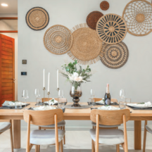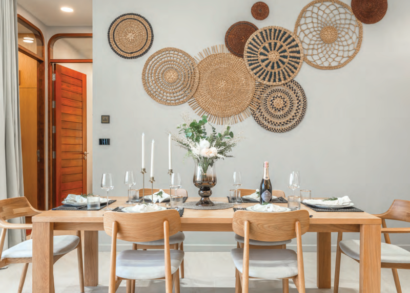 Interiors are tastefully decorated in neutral tones with natural textures, reflecting the harmony between modern design and tropical tranquility.