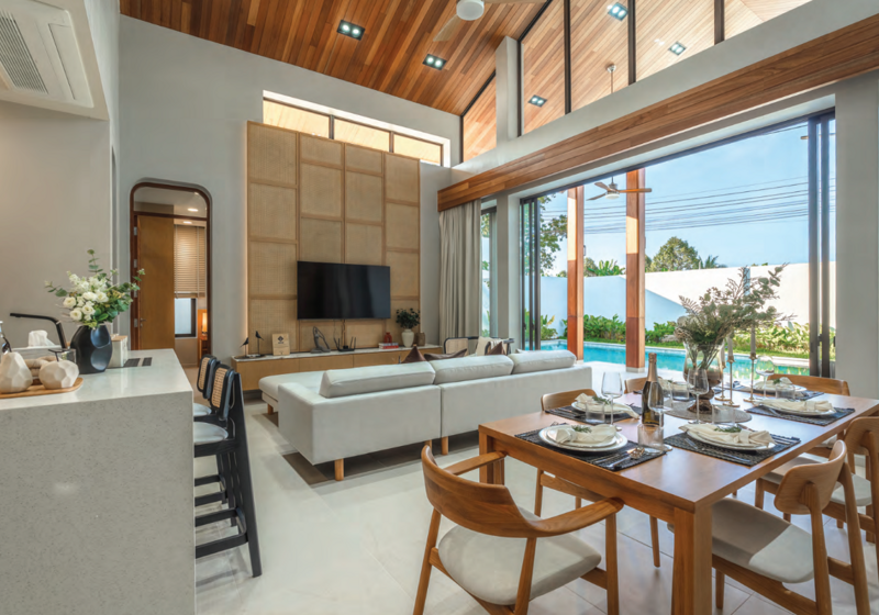 Spanning generous living space, the villa features three bedrooms and four bathrooms, an open-plan living and dining area, and a private swimming pool framed by lush landscaping.